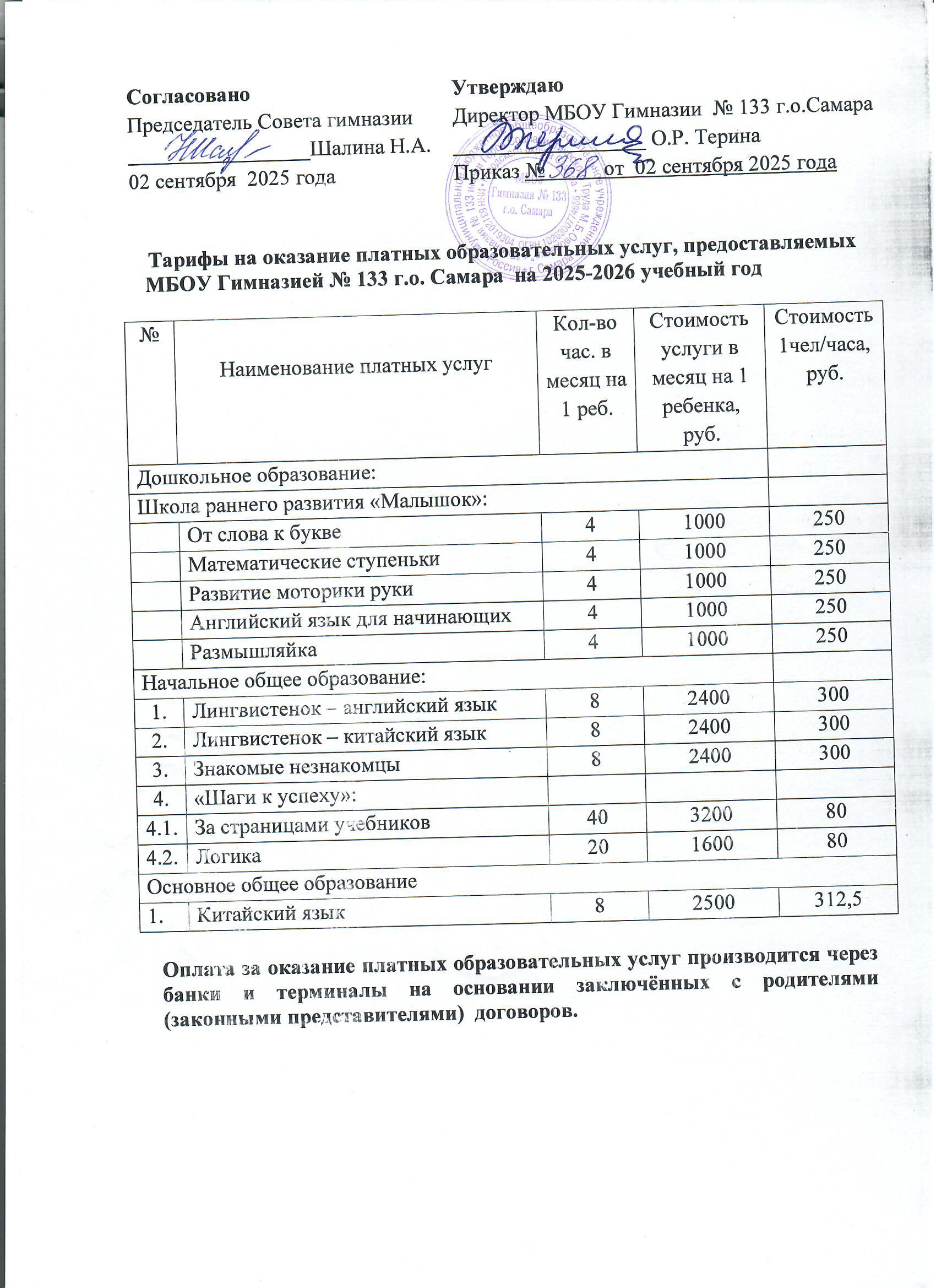 Тарифы на оказание платных образовательных услуг на 2025-2026 учебный год